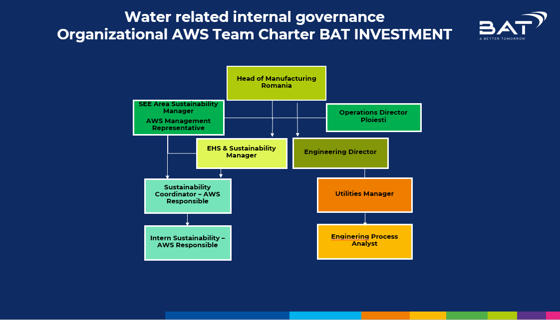 BAT INVESTMENT Ploiesti, one of the 3 economic entities of BAT group in Romania, constantly invests in sustainability and is proud that its efforts for the responsible use of resources are acknowledged. One of the most important certifications is the Alliance for Water Stewardship Standard (AWS), received in 2022. Globally, 70% of the BAT factories are AWS certified.